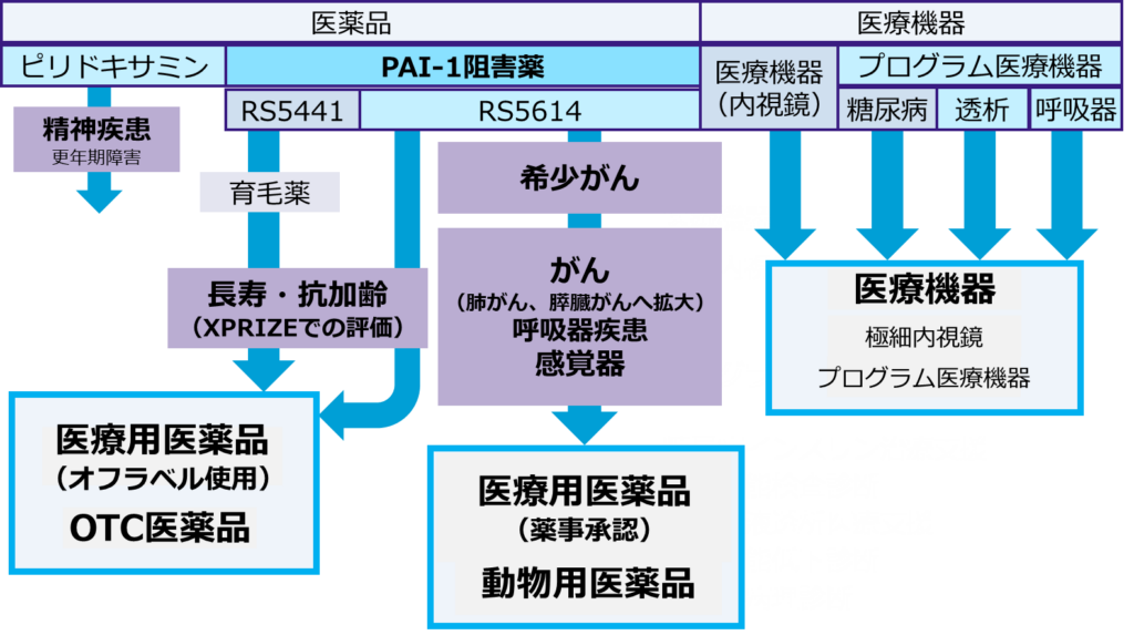 医薬品領域では、PAI-1阻害薬RS5614(がん、抗加齢・長寿)やRS5441(男性型脱毛症及び加齢性脱毛症外用薬)の開発が主体です。PAI-1阻害薬RS5614は、免疫系を活性化しがん細胞や老化細胞の除去を促進させるなどの作用の他に、抗血栓、抗炎症や抗線維化など多様な作用を有しています。