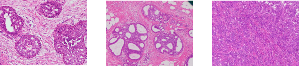 A histopathological microscopic image is created by thinly slicing and staining tissue, such as breast cancer tissue or lymph nodes, removed during surgery and then capturing it under a microscope. Observing the tissue in this way allows for the assessment of the presence of cancer cells, their morphology, growth patterns, and the extent of spread to surrounding tissues. This provides important information that helps evaluate the effectiveness of the surgery and guides decisions regarding further treatment.